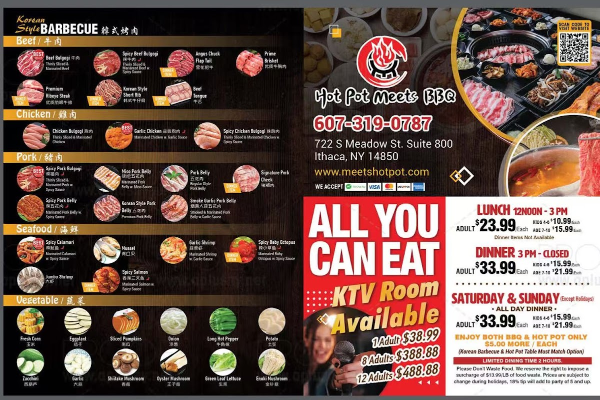The menu at Hot Pot Meets BBQ Menu offers an exciting fusion of flavors that bring together the best of both worlds. Located at 722 S Meadow St, Ithaca, NY, this spot invites you to indulge in a variety of dishes that are perfect for those craving both hearty barbecue and the communal joy of hot pot. From sizzling meats grilled to perfection to a vibrant selection of fresh vegetables and savory broths, each dish is crafted to offer a truly unique dining experience. Whether you’re looking to enjoy a deliciously tender cut of meat or immerse yourself in the rich, flavorful depths of hot pot, this menu has something to satisfy every craving.